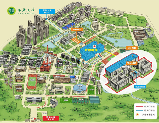 本次考试区域设在学校第六教学楼C区,考生从第六教学楼B区入口进入考场,导航地址为“西华大学6B楼”。从西华大学各大门到考试区域步行预计20分钟左右(具体路线见考点示意图)。