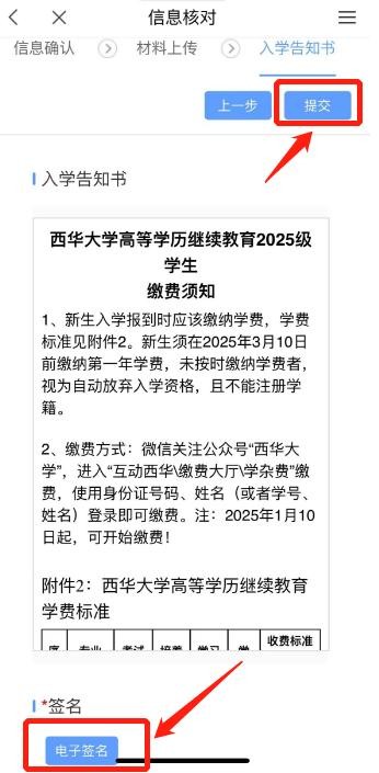 六.阅读入学告知书阅读完入学告知书后,点击左下角蓝色【电子签名】,完成签名后点击右上角【提交】